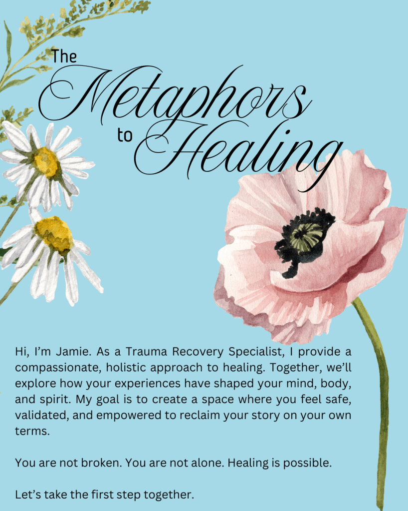 As a trauma recovery specialist and graduate from the International Association of Trauma Recovery Coaching, I take a holistic approach. In addition to sharing your story, we explore how your story has affected your mind, body, nervous system, and spirit as a whole. My goal is not to pathologize or label you, but instead, to normalize how trauma affects our whole being, and how other’s perceive us as well. Together, we evaluate how past coping skills protected us, and explore how they may no longer be serving us.